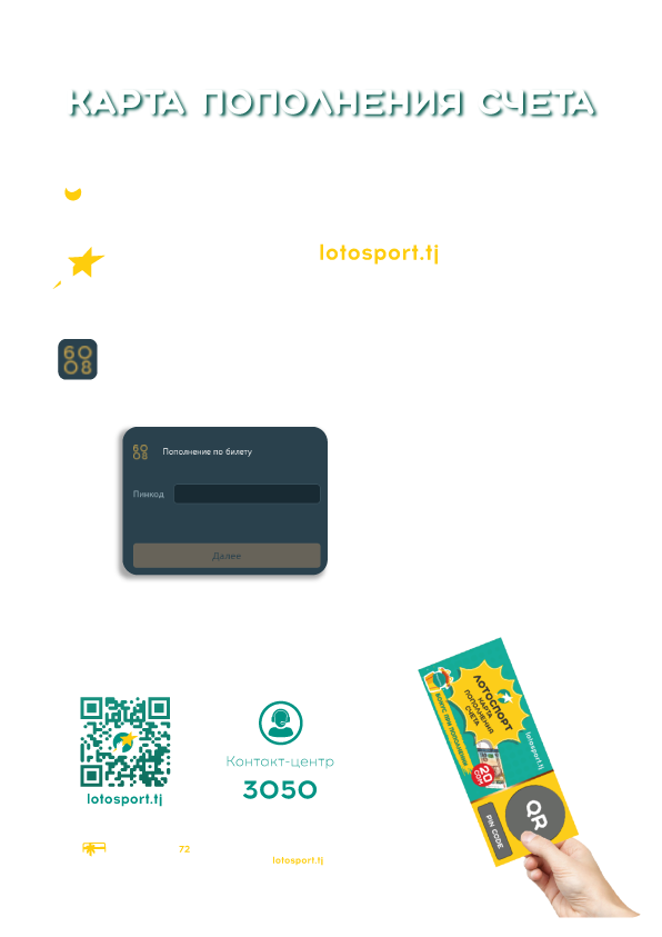 Как активировать карту пополнения счета, мы рассказали Вам в инструкции, представленной на данной странице! Номинал карты пополнения счета соответствует сумме, которая будет зачислена на Ваш лицевой счет, более того приобретая и активируя в вашем личном кабинете карту пополнения счета на сумму 100 и более сомони, Вы получаете начисление кешбэк** в сумме 10 % от произведенного пополнения.